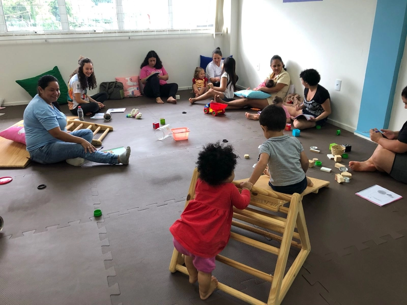 Um grupo de pessoas está sentada nos tatamas do CCI Morumbi. Em destaque, dois bebês sobem uma escadaria Pikler. Atrás, estão mulheres e alguns bebês.