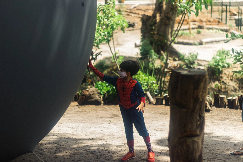 Pequeno homem-aranha em contato com a bolha cinza da campanha #LivreParaBrincarLaFora em Fortaleza (Crédito: Felipe Cardoso/Escola de Notícias)