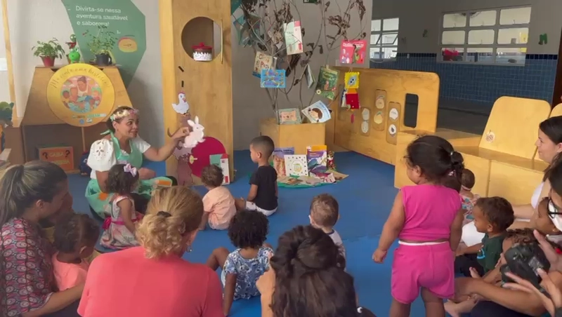 Crato (CE) transformou sua bebeteca em um cenário lúdico, imergindo as crianças na história contada: uma galinha, um cachorro, um urso, um coelho e até uma garota saindo de uma torre: todos em busca de um bolo!