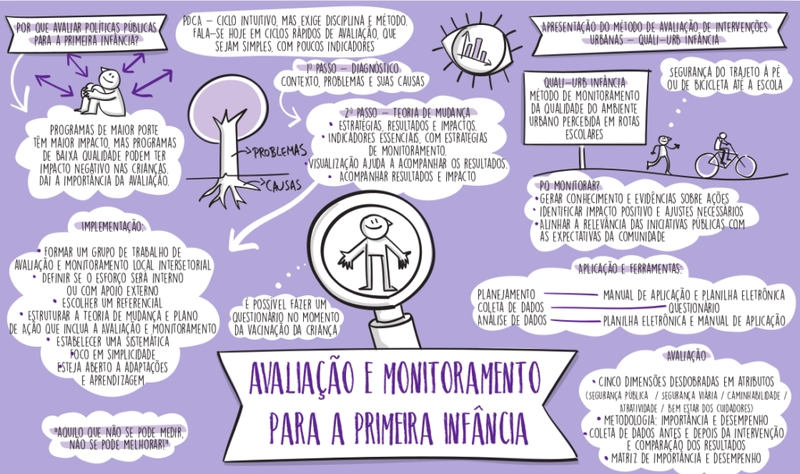 Cidades Urban95 acompanharam o 12º webinar temático com um olhar para esforços e impactos quando falamos de primeira infância e espaços urbanosAs cidades da Rede Urban95 se reuniram na manhã de quinta-feira (05/08) para o webinar “Avaliação e monitoramento de políticas para a primeira infância”. O evento contou com a participação de Eduardo Marino, da Fundação Maria Cecilia Souto Vidigal, Andressa Lopes Ribeiro da WRI Brasil, e Tânia Batistela Torres, representante da Prefeitura Municipal de Canoas e consultora do método Quali-Urb Infância, para rotas escolares. O grupo discutiu alguns caminhos para beneficiar bebês e crianças pequenas nas cidades e desenvolver respostas mais efetivas para suas necessidades.Assista ao webinar completo.Representante da Fundação Bernard van Leer no Brasil, de onde lidera a iniciativa Urban95, Claudia Vidigal abriu o evento relembrando o histórico da fundação com o monitoramento de políticas em São Paulo, especialmente na parceria com o Instituto Cidades Sustentáveis, de onde surgiu o Mapa da Desigualdade da Primeira Infância. Com 26 indicadores nas mais diversas áreas da administração pública, o Mapa aponta prioridades e necessidades dessa população nos 96 distritos da capital paulista.“A partir do Mapa, foram definidos 10 territórios prioritários para intervenção com foco na primeira infância e, com o avanço das ações, os Territórios Educadores estão cada vez mais próximos de se tornarem realidade. Avançamos em parceria com o município de São Paulo para entender cada vez melhor os territórios”, completa Claudia.Eduardo Marino, da Fundação Maria Cecilia Souto Vidigal, apresentou dados de alguns programas voltados ao desenvolvimento da primeira infância nos Estados Unidos, com destaque para o Perry Preschool, iniciado nos anos 60 com grande impacto nas concepções sobredesenvolvimento infantil, tendo sido replicado em diversas escolas estadunidenses.Ele destacou ainda a importância da qualidade dos programas para garantir sua efetividade, sendo o monitoramento a garantia de que nenhum impacto negativo possa ser justificado. “Estamos ofertando programas de qualidade para as crianças? E com qual o impacto? Estas perguntas são as duas principais razões para a monitorar e avaliar”, resume.Facilitação gráfica do webinar (crédito: Coletivo Entrelinhas)Voltando ao município de São Paulo, o programa São Paulo pela Primeiríssima Infância ganhou destaque pela capacidade de monitoramento qualitativo e intersetorial, incluindo as 5 dimensões para o diagnóstico de indicadores do cuidado, que estão relacionados ao eixo da saúde, nutrição, segurança e proteção, cuidado responsivo e aprendizagem inicial.