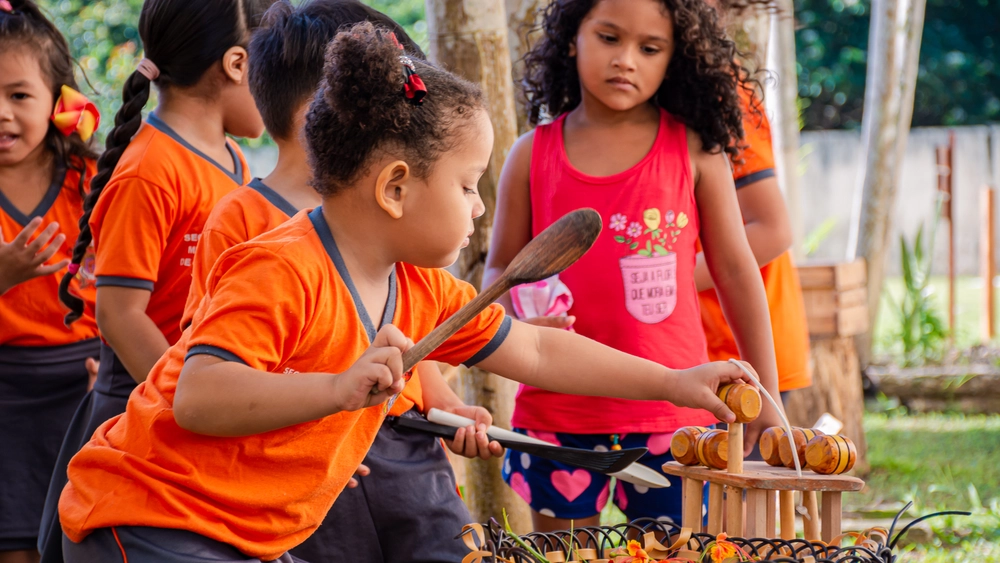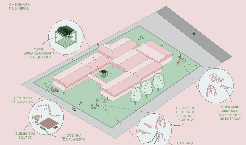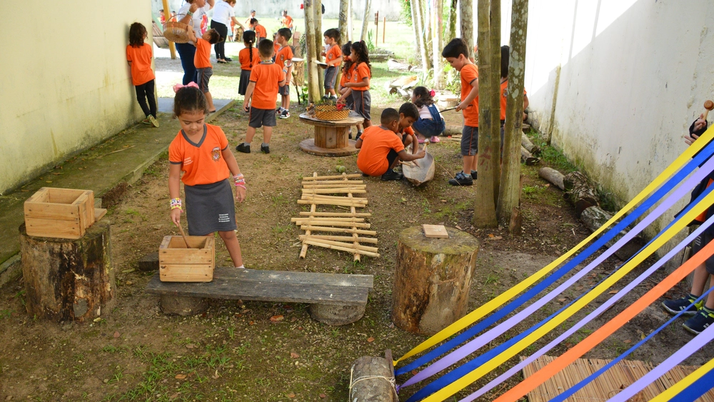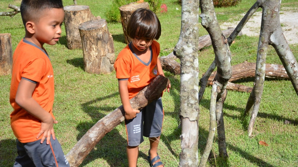 Outros elementos presentes foram a cozinha da floresta, a instalação de uma tapiri – uma construção coberta num formato conhecido da região, normalmente usada em vendas informais e que, na escola, proporcionou área sombreada e um palquinho –, além de um caminho de bolachas feitas de toras que ligam a entrada ao fundo da escola, onde está o pátio. Esse caminho levou a linguagem dos pátios naturalizados aos cuidadores – uma ideia que veio da Myrna Menezes, a gestora da escola, num convite aos pais que vinham buscar as crianças a entrar na unidade.