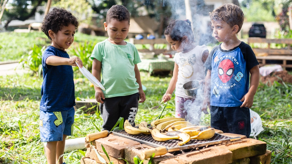 “As crianças ao ar livre se sentem mais calmas”, conta Gabriela. “O espaço fechado cansa, traz agitação e choro. No espaço aberto, elas podem correr, se mexer, a imaginação vai longe, vem a calmaria, o choro diminui e elas se concentram. Pode até parecer perigoso mexer numa fogueira, mas elas têm noção do limite, respeitam o espaço, entendem até aonde podem ir”.