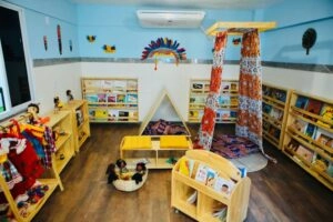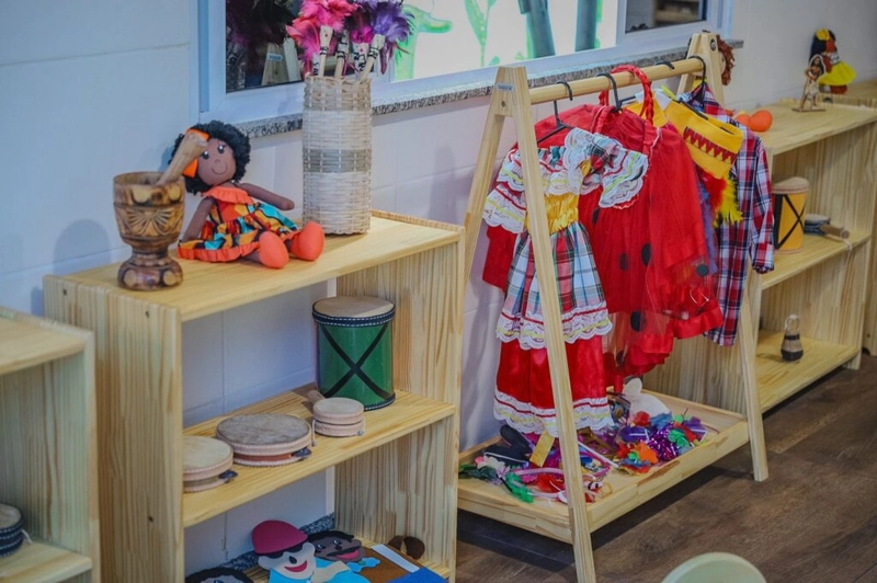 O espaço foi pensado para ser acessível e acolhedor, com mobiliário na altura das crianças para estimular a autonomia delas, brinquedos de pano e de madeira, decoração que traz elementos da cultura da região, e instrumentos musicais como atabaques, pandeiros e berimbaus. A bebeteca se conecta a uma área externa verde, que conta com redes e brinquedos naturalizados.